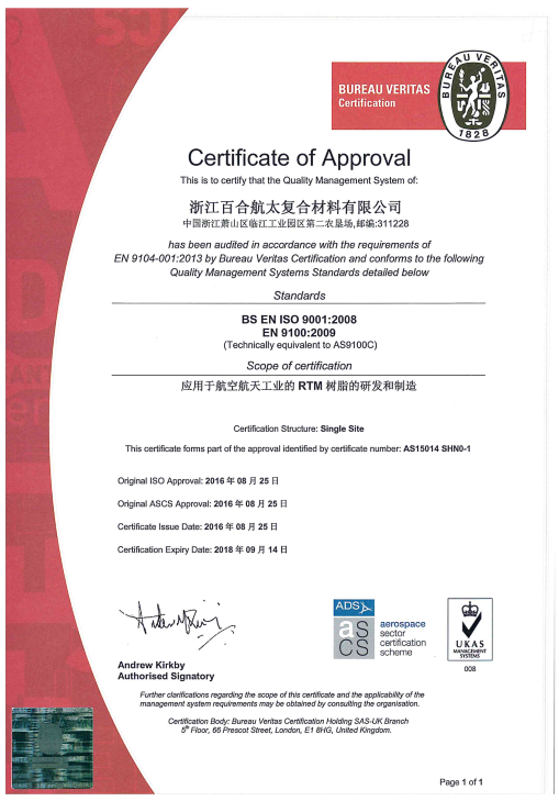 浙江百合航太复合材料有限公司成立于2014年,是集先进复合材料产品开发设计、生产、销售、服务于一体的高新技术企业, 主要产品有复合材料液体成型树脂、碳纤维、玻璃纤维和芳纶纤维预浸料、以及结构粘合剂胶膜等。